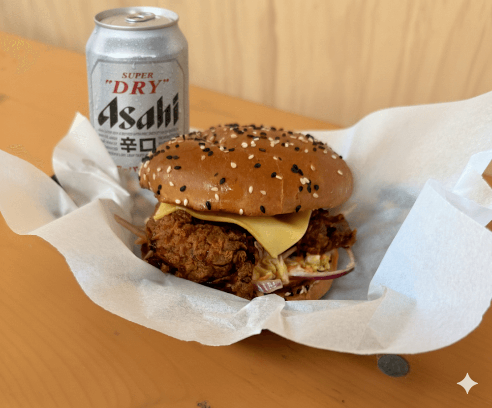 Smashed Beef, Bacon, 2 slices of American Cheese, Caramelised Onions, Pickles, Sweet and Spicy BBQ Sauce, Lettuce, Aioli and a Sesame Brioche Bun